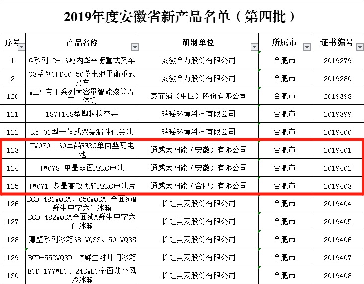 通威太陽能三項新產品通過“2019年安徽省新產品(第四批)”認定