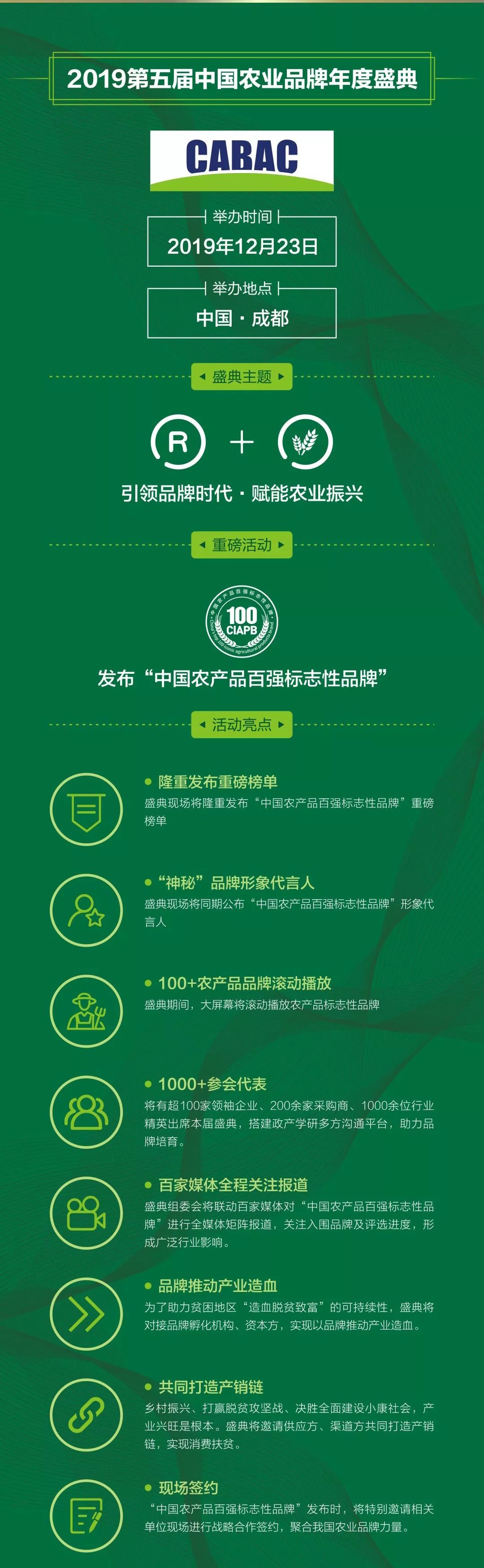 12月23日,第五屆中國農(nóng)業(yè)品牌年度盛典即將啟幕,屆時,30余位各級相關(guān)政府部門領(lǐng)導(dǎo)、50余位農(nóng)業(yè)專家學(xué)者、超100家農(nóng)業(yè)產(chǎn)業(yè)化龍頭企業(yè)、200余家采購商及銷售平臺、1000余位行業(yè)精英及上百家主流及行業(yè)媒體將出席本次盛典。