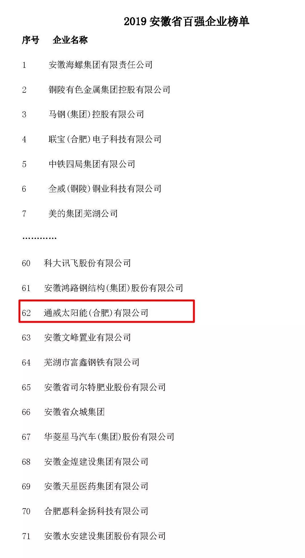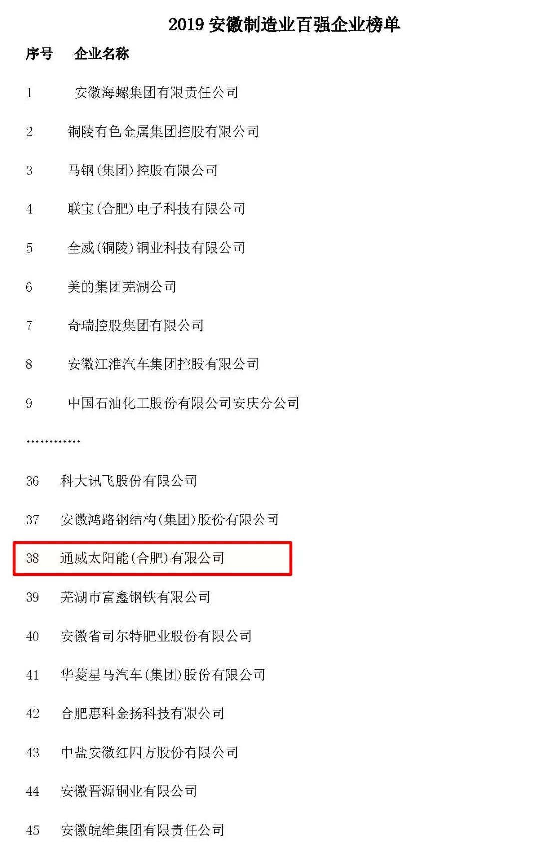 通威太陽能合肥公司榮列2019安徽省百強(qiáng)企業(yè)、制造業(yè)百強(qiáng)榜單