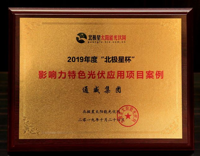 10月24日,由北極星電力網和北極星太陽能光伏網主辦的2019光伏新時代論壇暨第八屆“北極星杯”光伏影響力品牌頒獎典禮在京隆重召開。經過專家團客觀公正的評選,論壇對2019年為我國光伏產業發展作出杰出貢獻的企業進行表彰。通威首創的“漁光一體”模式,榮獲“特色光伏應用項目”榮譽獎項。