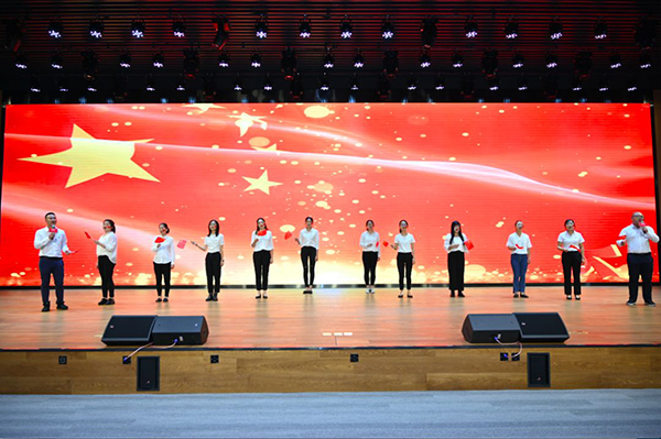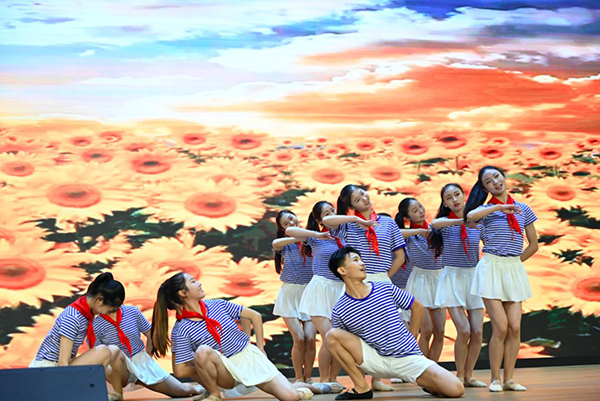 升旗儀式結束后,與會人員移步至報告廳開展了系列文藝匯演,進行了舞蹈表演、詩朗誦、獨唱、集體過政治生日等形式多樣、豐富多彩的活動,通威太陽能黨員代表作了題為《紅色聚能 光伏筑夢》的主題演講,展現了通威太陽能在黨支部發展過程中,結合自身特質和發展實際形成了黨支部發揮“紅色聚能板”的核心文化?;顒釉凇陡璩鎳返泥诹粮杪曋袌A滿結束。