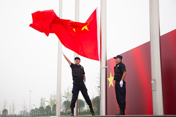 上午9時30分許,迎著朝霞、踏著軍樂,以通宇物業員工組成的國旗護衛隊邁著整齊有力的步伐,護衛著國旗步入現場。在雄壯豪邁的國歌聲中,鮮艷的五星紅旗冉冉升起。大家行注目禮,送上了對祖國最美好的祝福,衷心祝愿偉大祖國更加繁榮富強,明天更加美好!