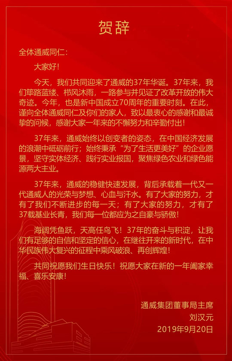通威37歲華誕,劉漢元主席致全體通威人的賀信!
