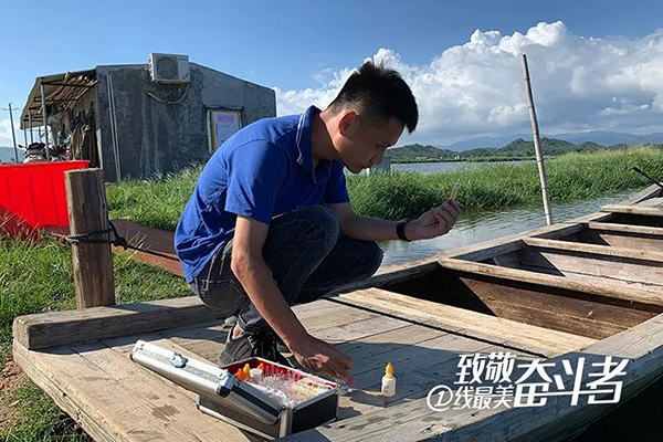 粵東8月的陽光與塘頭的暑氣令人眩暈,收蝦結束的時候臨近中午,我們跟隨朱俊杰在塘頭暴曬了兩個多小時,汗流浹背、頭皮發(fā)燙。下午3點,他又頂著烈日酷暑為客戶做測水實驗。