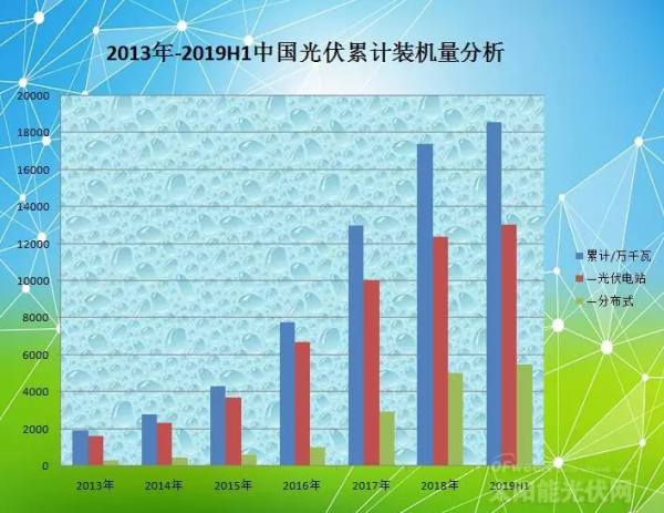 近日,國(guó)家能源局發(fā)布了2019年上半年光伏發(fā)電建設(shè)運(yùn)行情況,數(shù)據(jù)顯示,截至2019年6月底,全國(guó)光伏發(fā)電累計(jì)裝機(jī)185.59GW,同比增長(zhǎng)20%,新增11.4GW。其中,集中式光伏發(fā)電裝機(jī)130.58GW,同比增長(zhǎng)16%,新增6.82 GW;分布式光伏發(fā)電裝機(jī)55.02 GW,同比增長(zhǎng)31%,新增4.58 GW。