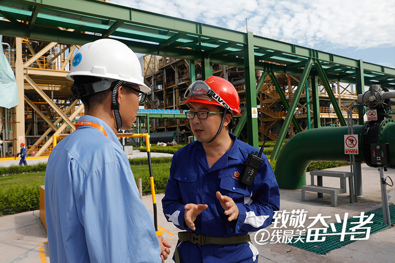 從日出到日落,陶勛貴每天的工作都滿滿當當。陶勛貴說,最辛苦還是在還是去年11月,那時距離投產只有一個月,天公又偏偏不作美,接連下雨,導致工期緊張。當時冷氫化工段的循環水裝置投運關系整個項目進展,為讓該裝置盡快投入使用,陶勛貴和工段員工全員參與循環水管道清洗,保障裝置能快速投入使用。