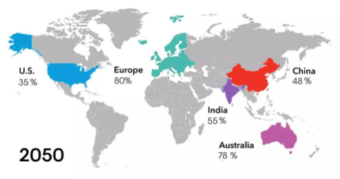 全球主要的用電和發電地區將出現不同的發電結構變化,總體來講,可再生能源(包括風電或光伏)將大幅增加,燃煤及核電將逐步減少。