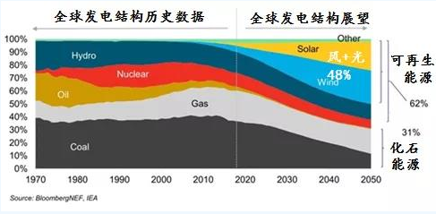 2019年7月,彭博新能源財經發布了2019-2050年全球新能源市場展望,預計到2050年,風電和光伏將占全球電力系統近一半的裝機量,并在2030年前幫助電力行業保持在控制溫升2度以內的軌道上。