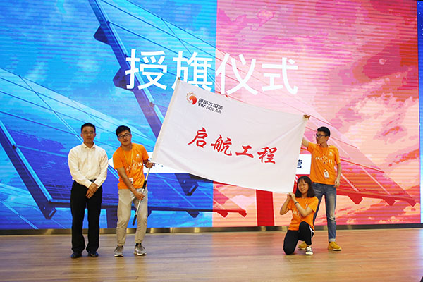 隨后,通威大學光伏學院老師從項目背景、集訓規劃、發展通道三個方面對“啟航工程”項目做了全面介紹。為了充分體現儀式感,促進學員們的奮斗熱情,光伏學院精心設計了授旗儀式、宣誓儀式、班級文化展示等一系列活動環節。最后,兩地2016年“啟航工程”優秀學員代表,向學員們分享了自己從一名應屆畢業生成長為工程師的點點滴滴。開營儀式在學員們熱情的掌聲中完美落幕。