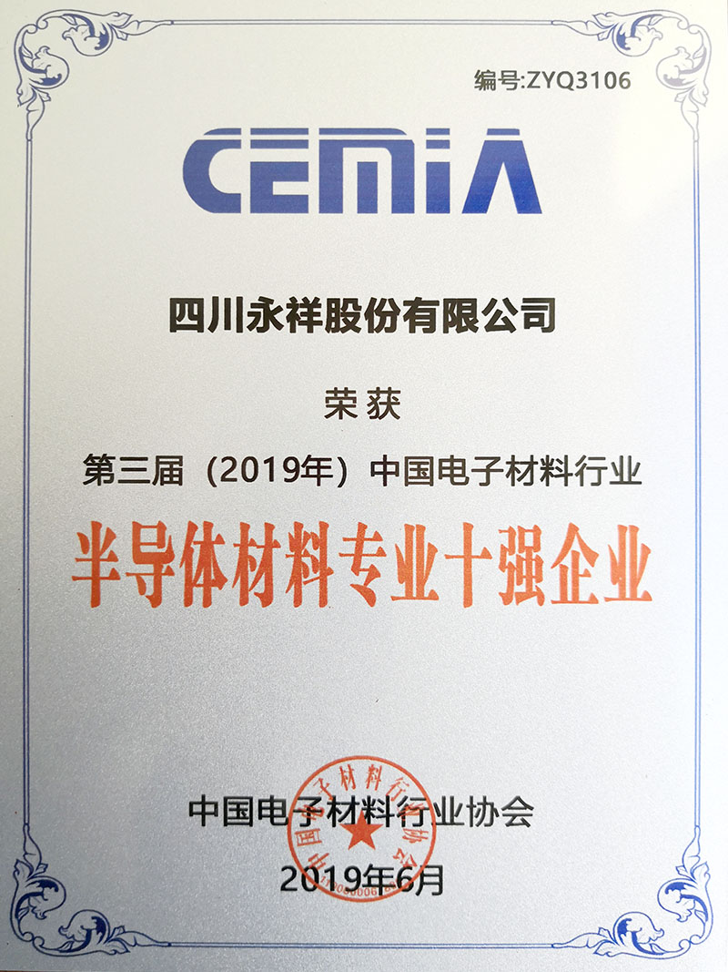 6月13日,2019年中國(guó)電子新材料產(chǎn)業(yè)發(fā)展峰會(huì)暨第三屆中國(guó)電子材料行業(yè)五十強(qiáng)企業(yè)發(fā)布會(huì)在浙江海寧隆重召開(kāi)。永祥股份憑借領(lǐng)先行業(yè)的技術(shù)優(yōu)勢(shì)榮登中國(guó)電子材料行業(yè)五十強(qiáng)企業(yè)和中國(guó)電子材料行業(yè)半導(dǎo)體材料專業(yè)十強(qiáng)企業(yè)兩項(xiàng)榜單。
