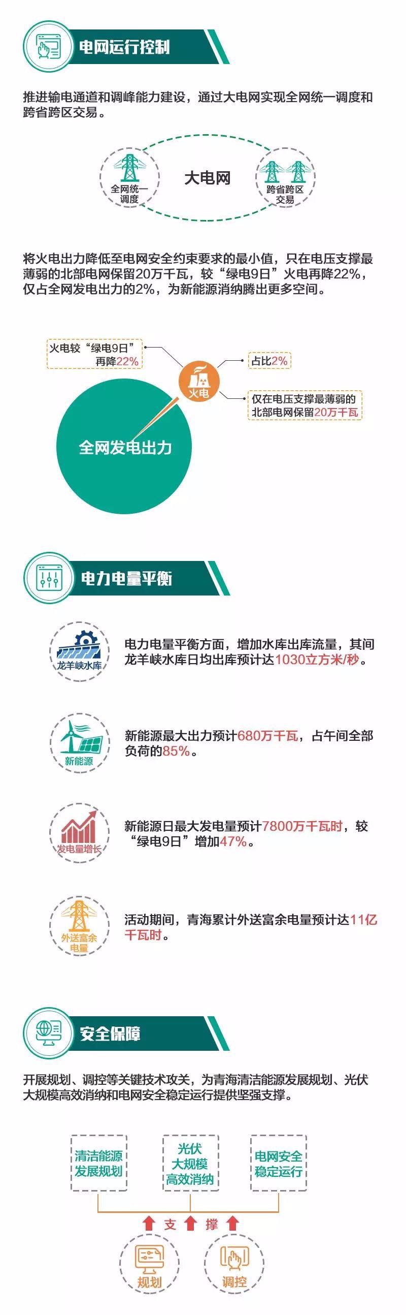 2017年6月 青海“綠電7日”國家電網(wǎng)公司首開一省全清潔能源供電之先河,實(shí)現(xiàn)青海連續(xù)7天168小時(shí)用電零排放。“綠電7日”不僅創(chuàng)下了全清潔能源供電的世界紀(jì)錄,更向人們展示了使用清潔能源的廣闊前景;2018年6月 青海“綠電9日”國家電網(wǎng)公司再次在青海組織實(shí)施“綠電9日”活動(dòng),刷新由自己保持的世界紀(jì)錄。綠電9日與7日相比,不僅僅是時(shí)間上的延長,更是通過機(jī)制和技術(shù)創(chuàng)新,讓電能產(chǎn)、供、用各環(huán)節(jié)深度參與,為能源轉(zhuǎn)型匯聚力量;2019年6月 青海“綠電15日”國家電網(wǎng)公司又一次在青海開展“綠電15日”創(chuàng)新實(shí)踐,將充分發(fā)揮電網(wǎng)在能源匯集傳輸和轉(zhuǎn)換利用中的作用,以樞紐型、平臺(tái)型、共享型為功能定位,吸引更多的利益方共同參與,倡導(dǎo)引領(lǐng)能源綠色發(fā)展。