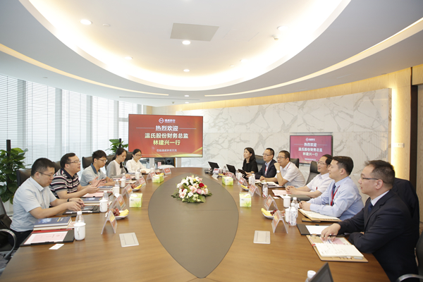 5月30日,溫氏股份財務總監林建興一行蒞臨通威訪問交流,通威股份嚴虎副董事長熱情接待并座談。