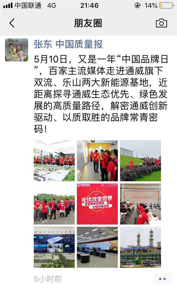 5月10日-11日,由通威集團品牌傳播體系策劃的“光伏改變世界·百家媒體進通威”大型傳播活動在社會及行業內引起巨大反響。短短2天時間,通過實地參觀通威新能源產業一線,媒體團深入了解了中國光伏在智能制造、綠色發展等方面的亮眼成績,贊嘆之余通過鏡頭和筆觸,深入挖掘、詳盡展示“通威樣本”,其中,新華社等權威媒體發布的《“光伏改變世界” 百家媒體進通威探尋光伏“秘密”》、《聚焦光伏產業新能源未來,百家媒體走進通威》、《聚焦光伏產業綠色發展——百家媒體走進通威》等稿件得到廣泛關注與轉發,“通威現象”再次引發話題熱潮。