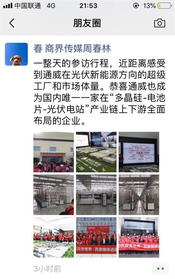 非常有幸參加“百家媒體進通威”活動,本次活動讓媒體人離開資料堆,實地感受全球最先進的光伏電池片和高純晶硅的制造工廠,真正的眼見為實!中國光伏產業的進步,需要無數科研人員、工程師和一線工人付出巨大的努力,感謝通威為產業進步做出的不懈努力和卓越貢獻。光伏行業的發展,需要通威等企業的實干精神,也需要劉漢元主席這樣的企業家的大決心、大格局和大情懷!