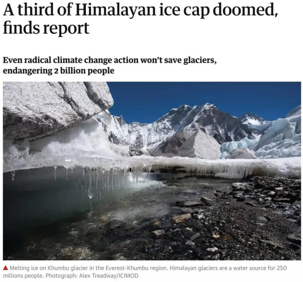 該報(bào)告的負(fù)責(zé)人菲利普·韋斯特說(shuō):“在不到一個(gè)世紀(jì)的時(shí)間里,全球變暖將會(huì)讓興都庫(kù)什-喜馬拉雅地區(qū)那些被冰川覆蓋的寒冷山峰變成裸露的巖石。”