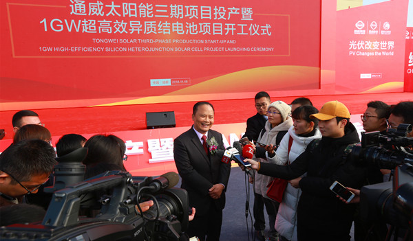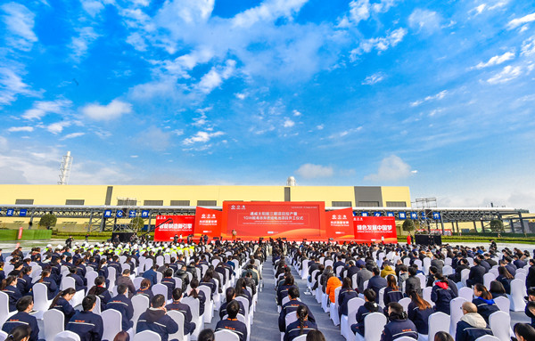 11月18日,通威太陽能三期項目投產暨1GW超高效異質結電池項目開工儀式在成都市雙流區隆重舉行。中共四川省委統戰部副部長、四川省工商聯黨組書記、常務副主席陳泉,成都市人民政府副市長曹俊杰,中共雙流區委書記韓軼,中共雙流區委副書記、區長鮮榮生,十一屆全國政協常委、全國人大代表、通威集團董事局劉漢元主席,通威集團管亞梅董事長,通威集團總裁、通威股份禚玉嬌董事,通威股份副董事長嚴虎,通威股份總裁郭異忠,通威股份董事、通威太陽能董事長謝毅等領導及嘉賓出席,行業合作伙伴、金融證券機構、主流媒體及通威太陽能合肥、成都兩地公司主要管理班子和員工代表近500人見證了這一重大時刻。