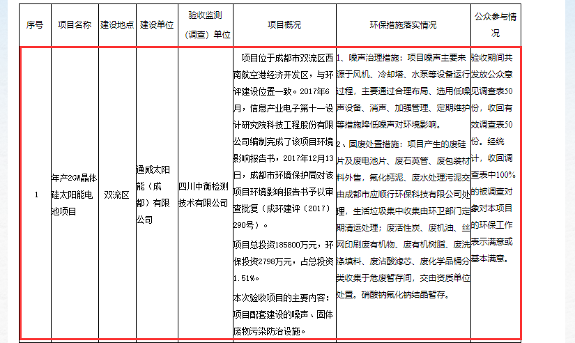 9月25日,通威太陽能成都公司收到成都市環(huán)境保護局《關于通威太陽能(成都)有限公司年產2GW晶體硅太陽能電池項目配套建設的噪聲、固體廢物污染防治設施竣工環(huán)境保護專項驗收批復》文件,通威太陽能成都公司年產2GW晶體硅太陽能電池項目通過環(huán)評驗收。