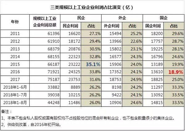 注意上表中的三列占比演變數(shù)據(jù)。規(guī)模以上工業(yè)企業(yè)中,民企的利潤(rùn)占比從2011年到2015年呈現(xiàn)持續(xù)上升趨勢(shì),從27.1%上升到峰值的35.1%,然后,伴隨著供給側(cè)改革的實(shí)施,民企的利潤(rùn)占比持續(xù)下降,到2018年8月份下降到26.0%。外企的利潤(rùn)占比始終穩(wěn)定在24%左右。而國(guó)企的利潤(rùn)占比演變規(guī)律則與民企剛好相反。從2011年的29.6%,下降到2016年的18.9%,此后伴隨著供給側(cè)改革,國(guó)企的利潤(rùn)占比迅速提升,到2018年8月份提升到33.5%。從這個(gè)角度上看,供給側(cè)改革的核心意義,就是以原材料漲價(jià)為核心手段提升相應(yīng)國(guó)有企業(yè)的利潤(rùn),并減少民企的利潤(rùn),也就是生產(chǎn)領(lǐng)域的利潤(rùn)再分配。
