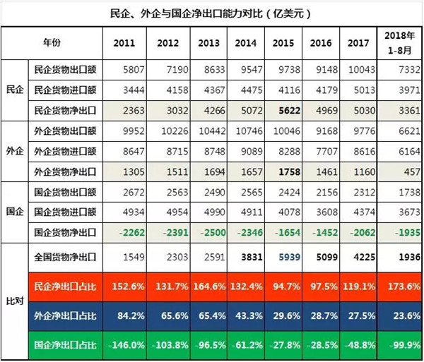 整體而言,2011年至2018年8月,民企的凈出口規(guī)模合計(jì)38978億美元,外企合計(jì)11818億美元,而國(guó)企的數(shù)據(jù)令人大開(kāi)眼界,合計(jì)-19717億美元。我建議各位再認(rèn)真的一個(gè)字一個(gè)字的讀一下這個(gè)數(shù)據(jù):-19717億美元。然后我們?cè)賮?lái)好好思考一下:國(guó)企能不能建立起出口能力?如果國(guó)企最終無(wú)法建立出口能力,那么,國(guó)企還能干什么?