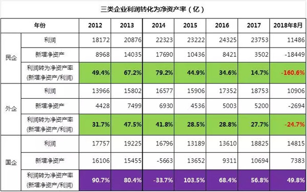 我們首先來(lái)看民企。民企的利潤(rùn)轉(zhuǎn)為凈資產(chǎn)率,從2012年到2014年還呈現(xiàn)上升態(tài)勢(shì),從49.4%提升到79.2%。這其實(shí)是非常不錯(cuò)的數(shù)據(jù)演變規(guī)律,照這么下去,民營(yíng)企業(yè)家們維持著越來(lái)越旺盛的再投資熱情,必將會(huì)承擔(dān)起更大的經(jīng)濟(jì)發(fā)展責(zé)任。但此后形勢(shì)突然逆轉(zhuǎn),到2015年就下降到了44.9%,到2017年已經(jīng)下降到14.7%,再到今年1-8月份,規(guī)模以上民營(yíng)工業(yè)企業(yè)掙了1.15萬(wàn)億的利潤(rùn),但是其凈資產(chǎn)規(guī)模相對(duì)2017年底居然整體下降了1.84萬(wàn)億(480891億-499918億)。這種凈資產(chǎn)規(guī)模下降,只能解釋為有大量的企業(yè)家選擇減產(chǎn)乃至是停產(chǎn),從“規(guī)模以上”這個(gè)總盤(pán)子里消失了。企業(yè)家們集體主動(dòng)或被動(dòng)選擇了這個(gè)危險(xiǎn)的方向,導(dǎo)致今年1-8月份的凈資產(chǎn)轉(zhuǎn)化率變成了一個(gè)負(fù)值,并且數(shù)值極大:-160.6%。