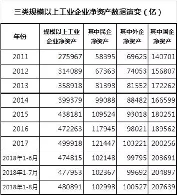 接下來(lái)要放上的數(shù)據(jù),是規(guī)模以上工業(yè)企業(yè)中三類(lèi)企業(yè)各自的凈資產(chǎn)數(shù)據(jù),數(shù)據(jù)來(lái)源為國(guó)家統(tǒng)計(jì)局月度數(shù)據(jù)庫(kù)中的總資產(chǎn)數(shù)據(jù)-總負(fù)債數(shù)據(jù)。注意,這一組凈資產(chǎn)數(shù)據(jù)本身沒(méi)啥意義,重要的是,我們可以根據(jù)利潤(rùn)與凈資產(chǎn)數(shù)據(jù),來(lái)演算兩組非常重要的數(shù)據(jù):凈資產(chǎn)收益率,以及更加重要的,利潤(rùn)轉(zhuǎn)化為凈資產(chǎn)率。所以下表各位可以不用細(xì)看,只需要稍微注意一下,國(guó)企的凈資產(chǎn)規(guī)模比民企和外企的總和還要多,說(shuō)明國(guó)企占有了最多的社會(huì)資源。