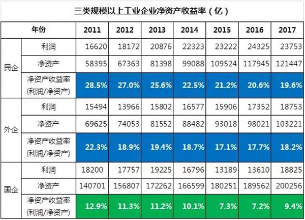 總利潤(rùn)÷凈資產(chǎn),就能得出一個(gè)很有意義的數(shù)據(jù):凈資產(chǎn)收益率。這個(gè)數(shù)據(jù)乃是反映企業(yè)經(jīng)營(yíng)效率的核心數(shù)據(jù)。通過(guò)比較民企、外企和國(guó)企的凈資產(chǎn)收益率情況,我們就能清晰的知道,到底誰(shuí)掙錢(qián)的能力更強(qiáng)。所以下表就是本文放出來(lái)的第一個(gè)大招。注意,本文后面還有兩個(gè)大招,各位在看完下表后不要急著抨擊某戰(zhàn)五渣,因?yàn)楹竺孢€會(huì)有更加震撼的數(shù)據(jù)。