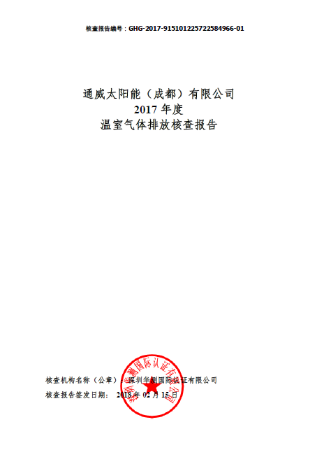 近日,深圳華測(cè)國(guó)際認(rèn)證有限公司根據(jù)《工業(yè)其他行業(yè)企業(yè)溫室氣體排放核算方法及報(bào)告指南(試行)》的要求對(duì)通威太陽(yáng)能(成都)有限公司2017年度的溫室氣體排放報(bào)告進(jìn)行核查,經(jīng)過(guò)對(duì)生產(chǎn)現(xiàn)場(chǎng)的認(rèn)真評(píng)審和各項(xiàng)數(shù)據(jù)源的詳細(xì)跟蹤核查,核查組認(rèn)為:通威太陽(yáng)能(成都)有限公司報(bào)告的2017年度核算邊界與排放源識(shí)別完整,活動(dòng)水平數(shù)據(jù)與排放因子選取準(zhǔn)確,溫室氣體排放信息和數(shù)據(jù)是可核查的,排放報(bào)告與核算方法符合指南要求,并出具2017年度溫室氣體核查報(bào)告。