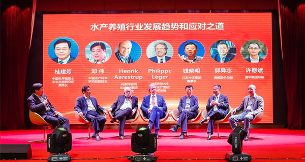 下午4時35分 ,在中國科學院院士、水生生物研究所原所長桂建芳的主持下,中國水產科學研究院副院長鄧偉,丹麥BioMar集團副總裁Henrik Aarestrup,英國BENCHMARK控股有限公司董事、比利時英偉水產集團全球總裁Philippe Leger,江蘇中洋集團董事長錢曉明,通威股份郭異忠總裁,澳華集團總裁許愿斌圍繞“水產養殖行業發展趨勢和應對之道”進行了熱烈討論與分享。