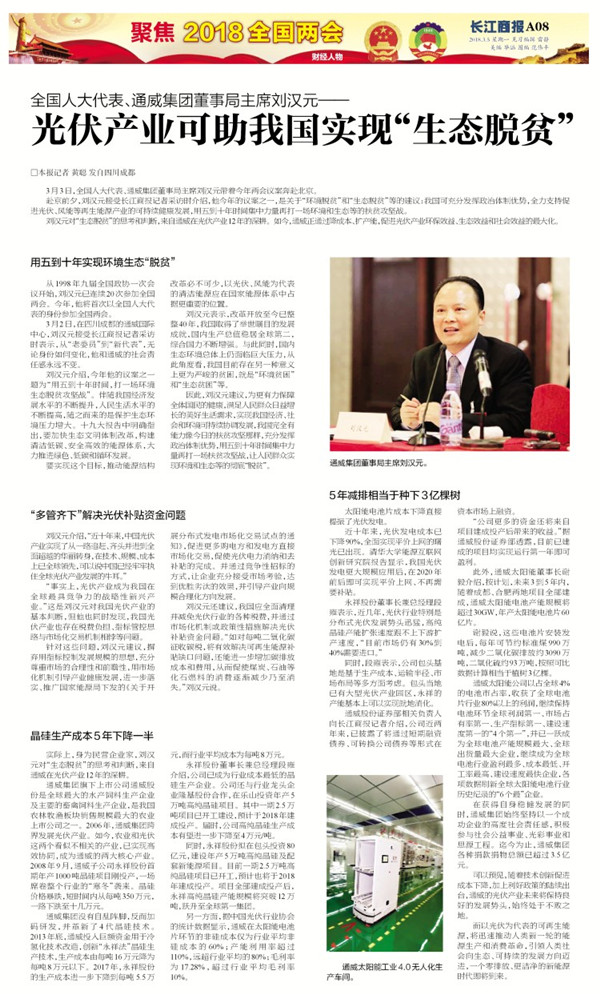 3月3日,全國(guó)人大代表、通威集團(tuán)董事局主席劉漢元帶著今年兩會(huì)議案奔赴北京。赴京前夕,劉漢元接受長(zhǎng)江商報(bào)記者采訪時(shí)介紹,他今年的議案之一,是關(guān)于“環(huán)境脫貧”和“生態(tài)脫貧”等的建議:我國(guó)可充分發(fā)揮政治體制優(yōu)勢(shì),全力支持促進(jìn)光伏、風(fēng)能等再生能源產(chǎn)業(yè)的可持續(xù)健康發(fā)展,用五到十年時(shí)間集中力量再打一場(chǎng)環(huán)境和生態(tài)等的扶貧攻堅(jiān)戰(zhàn)。