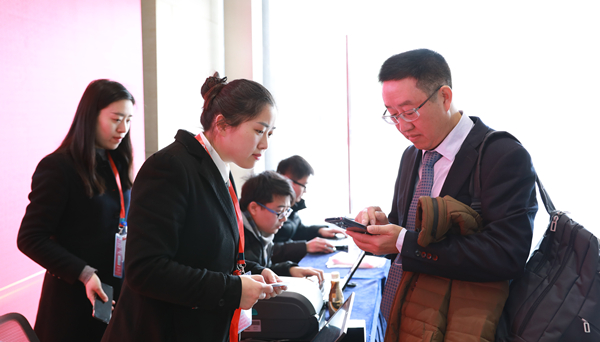 工作人員為嘉賓分發參會證