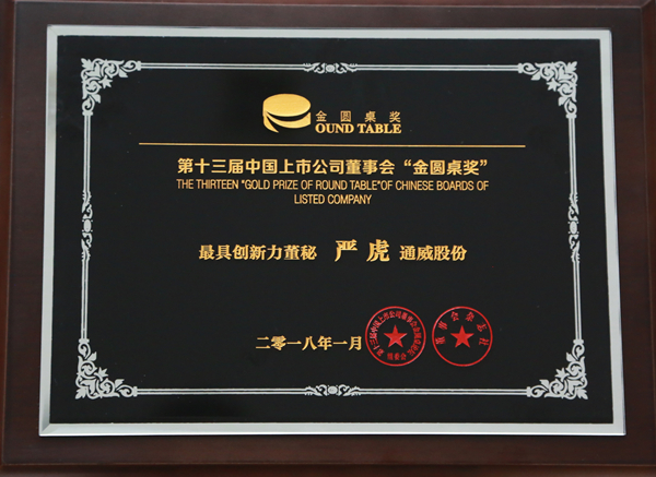 1月20日,由鳳凰出版傳媒集團旗下《董事會》雜志主辦的第十三屆中國上市公司董事會“金圓桌論壇”暨“金圓桌獎”頒獎盛典在北京隆重舉行。來自100余家上市公司以及政府、學界、新聞界在內的200余位高管、專家及學者出席此次活動,并圍繞“新均衡、新治理、新增長”主題展開熱烈討論。盛典期間,通威股份喜獲“優秀董事會”殊榮,通威股份嚴虎副董事長被授予"最具創新力董秘"稱號。