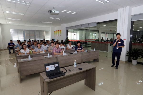 同學們分批來到行政樓二樓培訓室和S1電池片生產車間學習交流。在行政樓二樓培訓室,同學們詳細了解了通威集團的發展歷程,通威太陽能產能規模、發展情況等。