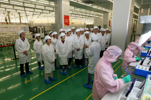 在S1電池車間,同學們詳細了解了成都基地太陽能電池片的生產流程和生產工藝。參觀結束后,通威“誠信正一”的經營理念,生產車間高度自動化的電池片產線、先進的科技設備以及嚴格規范的現場管理均給同學們留下了深刻印象。