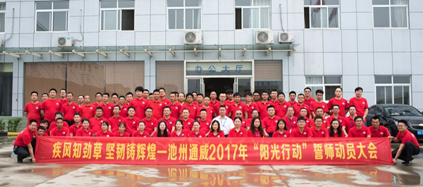 6月5日下午,以“疾風(fēng)知?jiǎng)挪荩瑘?jiān)韌鑄輝煌”為主題的池州通威2017年“陽光行動(dòng)”誓師動(dòng)員大會(huì)在池州通威大會(huì)議室隆重召開。池州通威總經(jīng)理董清泉、池州畜禽營(yíng)銷公司總經(jīng)理陳勇及公司全體員工100余人參加此次大會(huì)。