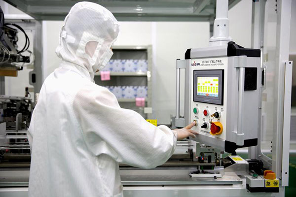合肥公司電池一廠員工正在調(diào)試3號(hào)倒片機(jī)