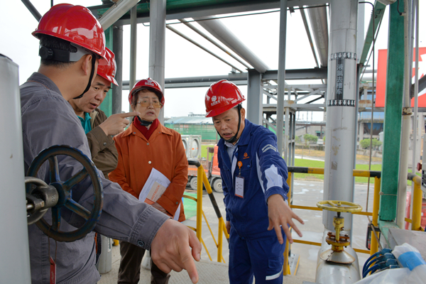 隨后,周總帶領專家組一行來到液氯充裝站,并介紹其液氯儲槽廠房設施的布局、液氯充裝站的有效安全管理、操作崗位的標準細則等。專家組現(xiàn)場安排兩名充裝人員、一名檢查人員進行充裝示范,檢查了現(xiàn)場監(jiān)控攝像、計量器具的配置情況、崗位防護用品是否到位等。隨即在會議室進行大量資料審查,檢查液氯充裝制度匯編、質量保證手冊、崗位操作人員持證情況、設備維護保養(yǎng)以及應急預案的演練等。