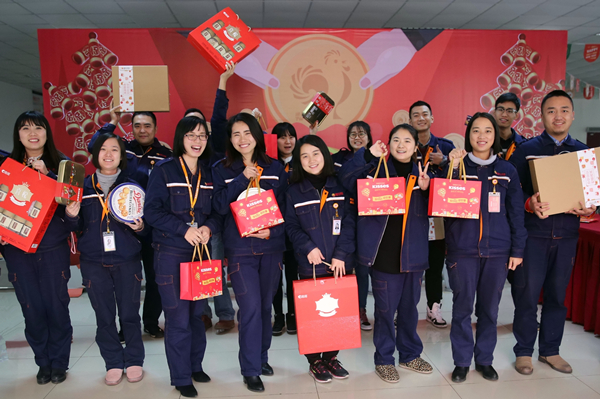 與此同時,成都公司豐富的新春禮品包,喜氣洋洋的祝福展板讓整個廠區溫情滿滿,喜悅多多。蘋果與橙子拼成的水果大禮包,寓意著 “橙意滿滿,蘋蘋安安”,光是這份用心就足夠感動大家。此外,甜甜的巧克力、精心包裝的堅果大禮盒更是讓驚喜一波接著一波。