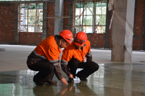 段董事長視察指導時,庫房正在做金剛砂地坪成品樣板,段董事長和李總對打磨程度不同的兩塊地坪進行了仔細比較,就個別瑕疵提出了解決方案。