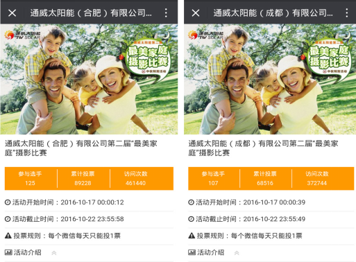 此次活動(dòng)以通過(guò)微信朋友圈分享鏈接邀請(qǐng)親朋好友參與投票的方式,共計(jì)收到投票15萬(wàn)次,頁(yè)面訪問(wèn)量達(dá)83萬(wàn)次,成為通威太陽(yáng)能(合肥、成都)有限公司2016年企業(yè)文化活動(dòng)中員工參與積極性和參與度最高的一次。