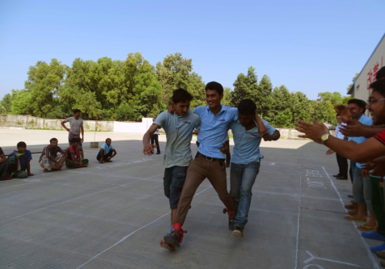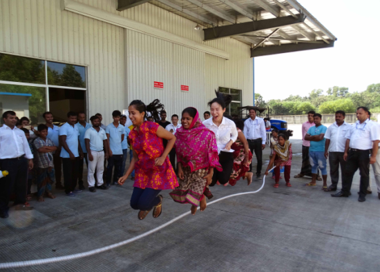 在“齊心協力”活動中,六組選手背靠背用身體將氣球夾住,積極商討和主動的配合口號聲很快就打破了最初的安靜,加油聲伴著歡笑。比賽分為個人賽和團體賽。個人賽不光考驗運動員的體力與技巧,還有領悟能力。團體賽則體現出了孟加拉通威人的團結與配合。這里不得不提女員工的表現,平日里文靜的財務部出納因涼鞋影響發揮,索性赤腳上場,觀眾們異口同聲的為她們計數“一、二、三、四……五十 !”女員工們節奏和速度明顯領先于其他隊伍,現場響起陣陣吶喊和助威聲。