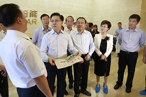 9月6日,中共四川省委王東明書記蒞臨通威太陽能(成都)有限公司考察調研,中共四川省委常委、省委秘書長吳靖平以及省發改委、省經信委主要領導陪同,成都市委書記唐良智,市委副書記、代市長羅強,雙流區委書記周先毅,雙流區委副書記、區長徐剛等陪同調研。十一屆全國政協常委、通威集團董事局劉漢元主席,集團禚玉嬌總裁,副總裁黃其剛,通威太陽能(合肥、成都)有限公司董事長謝毅熱情接待。