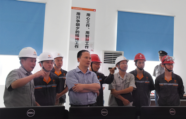 在永祥樹脂中控室,劉漢元主席察看設備運行情況