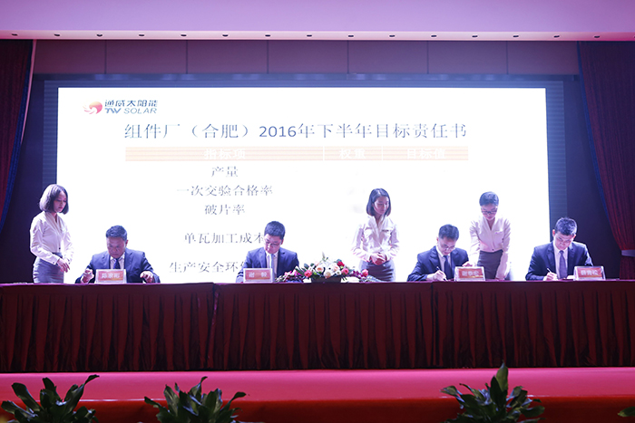 會議上,通威太陽能(合肥、成都)有限公司首席財務官周丹、高級副總裁張忠文、高級副總裁路廣軍首先從各自分管的部門工作出發,結合市場競爭現狀,總結了上半年取得的成績,強調了下半年努力的方向和期望達成的目標。通威太陽能(合肥、成都)有限公司首席運營官謝泰宏、高級副總裁陳家彬、高級副總裁張冠綸、采購部部長薛青松分別就產供銷和研發體系進行了總結計劃述職。隨后,產供銷三個系統分別與謝董事長簽訂了下半年年度目標責任書。