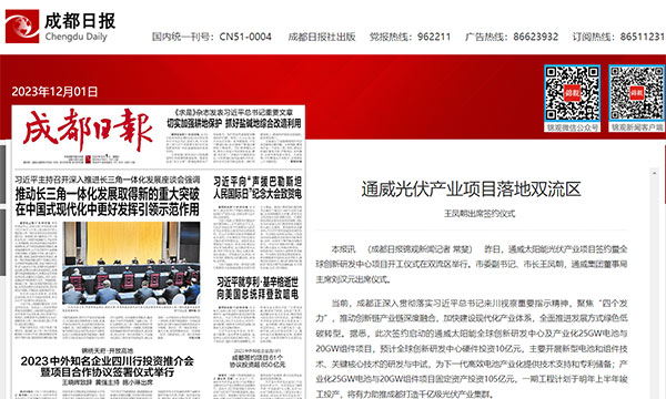 11月30日,通威太陽能光伏產業項目簽約暨全球創新研發中心項目開工儀式在通威太陽能雙流基地隆重舉行,獲得四川新聞網、成都電視臺、成都日報、蓉城政事、雙流發布及光伏行業多家主流媒體聚焦報道。