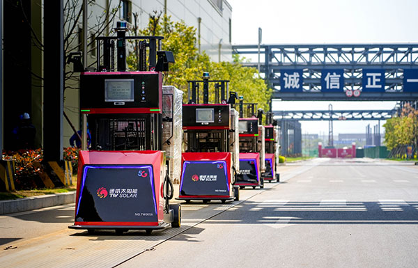 通威太陽能金堂基地5G智慧園區(qū)無人叉車運(yùn)送電池片