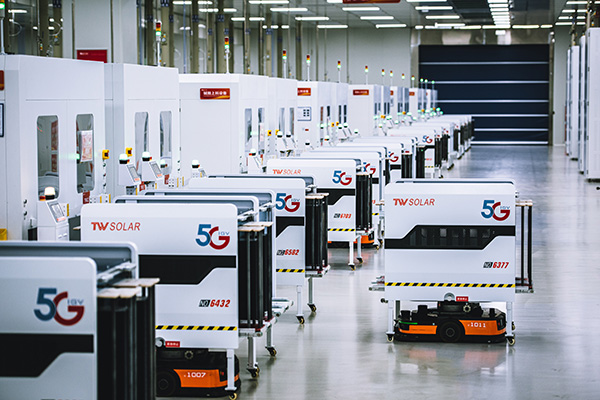 此外,通威還打造全球光伏行業首個5G智慧園區——通威太陽能成都金堂基地?;貎葥碛?1個足球場大小的無塵車間,32條全自動智能制造生產線高效運轉,數百臺智能小車來回穿梭運送物料,經過制絨、擴散、SE激光摻雜等10道工序,每天生產500多萬片太陽能電池片。這里的智能制造生產線,與同等產能的傳統太陽能電池片生產線相比,用工減少約62%,能源消耗降低約30%,生產效率提升約161%。