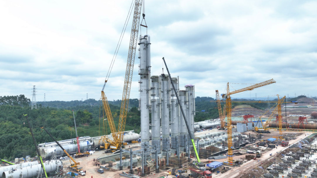 “決戰四季度,在場施工人員日均1200人以上,日均施工機械300臺以上。項目建設采取‘白加黑’、值班輪崗的模式,加快推進。”永祥能源科技項目指揮長助理馬彪介紹,該項目有主要裝置51個,截至目前,已陸續完成區域變電所、機柜間、消防水池等11個裝置土建工程的封頂工作,以及精餾筏板、尾氣回收筏板的澆筑。精餾塔吊裝正有序進行中,整個項目建設進度比計劃提前了2個月。