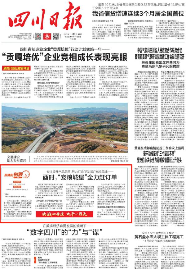 19時,天色已暗,生產線還在轟轟作響,“寵糧城堡”燈火通明。楊洪海和許多同事還在加班,為兩天后承辦的一場全國性寵物行業高質量發展論壇做準備。“今年我們的整體銷售額同比增長50%以上,產量也相應增長,超越行業平均增速。”楊洪海說,為在快速增長的寵物食品市場蛋糕中搶得更多份額,下一步公司將在研發、生產、銷售各環節持續發力,專注提升產品品質,努力打響“四川造”寵糧品牌。