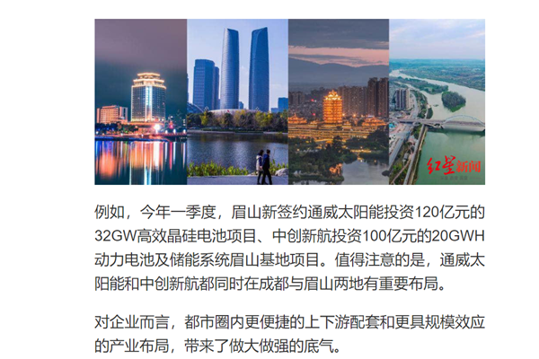 報(bào)道指出,都市圈內(nèi),既有成都市地理位置、科研院所、知名高校、營(yíng)商環(huán)境等突出資源優(yōu)勢(shì),又有德眉資土地資源、特色產(chǎn)業(yè)比較優(yōu)勢(shì)。強(qiáng)強(qiáng)聯(lián)合,便有了都市圈“研發(fā)+制造”的合作模式,讓建圈強(qiáng)鏈行動(dòng)在都市圈內(nèi)走深走實(shí)。例如,今年一季度,眉山新簽約通威太陽(yáng)能投資120億元的32GW高效晶硅電池項(xiàng)目。值得注意的是,通威太陽(yáng)能在成都與眉山兩地有重要布局。